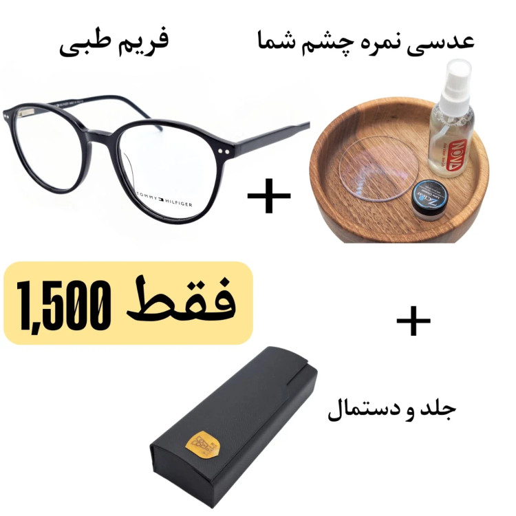 پکیج عینک طبی + عدسی ساخت کُره با نمره چشم شما + جلد و دستمال و اسپری